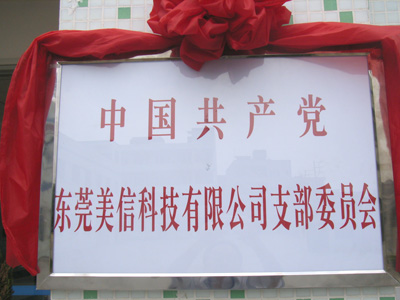 经中国共产党企石镇党委批准,中国共产党广东美信科技股份有限公司支部委员会于2007年5月30日正式成立,东莞美信科技有限公司总经理张定珍任党支部书记。企石镇党委工作人员、张总、方厂长及我厂部分党员代表参加了揭牌仪式。