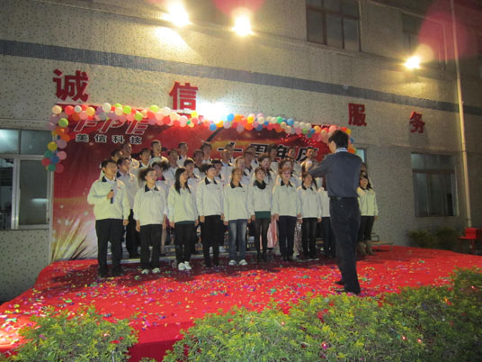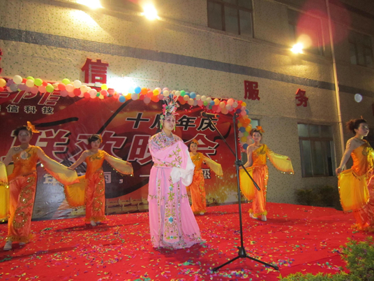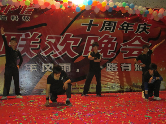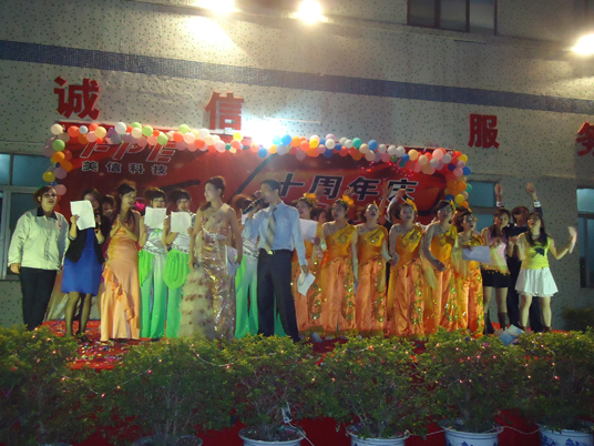 2010年11月26日18:00许,微风拂面,天空露出少见的湛蓝的底色,真是天公作美,庆祝东莞美信科技成立10周年晚宴及厂庆晚会即将在企石镇工厂的篮球场上举行。公司大门口迎面悬挂着“热烈庆祝美信科技成立10周年”红底黄字的横幅,门的两侧顶端悬挂着两个直径1.2米的大红灯笼,围墙上插满了五颜六色的彩旗,正对大门的是长7米,宽3.5米,高约1米的红色大舞台,舞台前沿放满了葱郁的绿色盆景, 舞台两侧是两个大大的红色升空氢气球,下面悬挂着两条醒目的横幅:“忆往昔,美信人十载艰苦创业风雨共济;展未来,一心开拓进取再创辉煌”, 舞台四周边沿镶嵌着闪烁的彩灯,其背后的晚会大幅喷绘背景布中间,有一硕大而鲜活的艺术字“美信10周年”字样,下边是“10年风雨,一路有您…..”,舞台的上面,则是从楼顶“美信科技”广告招牌基柱向两边呈放射状泻下的60条彩带, 整个晚会的现场布置给人以喜庆而庄重的感觉。