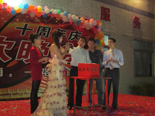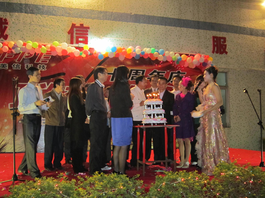 18:30董事长胡联全先生上台发表激情洋溢的致辞,之后,10年员工代表张晓林也登台抒发了自己10年的心历路程和真情感言,接着,公司总经理何应辉先生和副董事长张定珍女士为在公司连续工作五年以上的老员工颁发了金币和鲜花,董事长则亲自为在公司服务10年的老员工颁发了24K的金牌,并一起合影留念,随后,台上的几十位老员工一起为“美信科技十周年”庆生,大灯熄灭后,大家围着大生日蛋糕,点蜡烛,许愿,唱生日歌,《祝你生日快乐》的背景音乐同时响起,台上台下的员工及嘉宾共约300人一起忘情地跟着唱,场面温馨而感人……