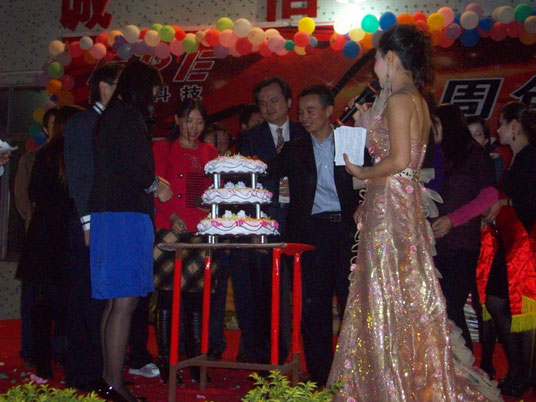 话音刚落, 清脆、震耳的鞭炮声响起, 同时, 四名经理级员工在舞台的四个角落同时放响礼炮, 七彩的碎纸片向舞台飘落, 瞬间,现场一片欢腾!