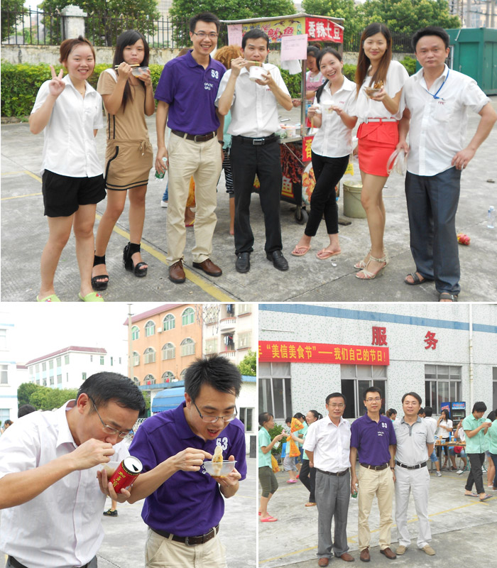 虽已至秋,但仍感炎热,酷热的天气,却抵挡不了我们对"美食节"的期待,终于在2013年8月28日迎来了全员盛事,美信"美食节"能顺利开展,并取得较圆满成功,离不开公司领导及同事对本次活动的大力支持,各部门组长及员工不惜利用中午休息时间,准备当天下午的美食佳肴,目的只有一个,就是能让本部门的美食在当天下午的活动中绽放光彩,得到员工的青睐,当然,他们也更希望他们的精心制作的美食能换取到更多的美食券,获得到更多的"销售利润"!同时,感谢本次活动在背后默默付出的工作人员,感谢你们,因为你们,增添了本次"美食节"的色彩,千言万语的感激,仅在此向您道一声"谢谢"。