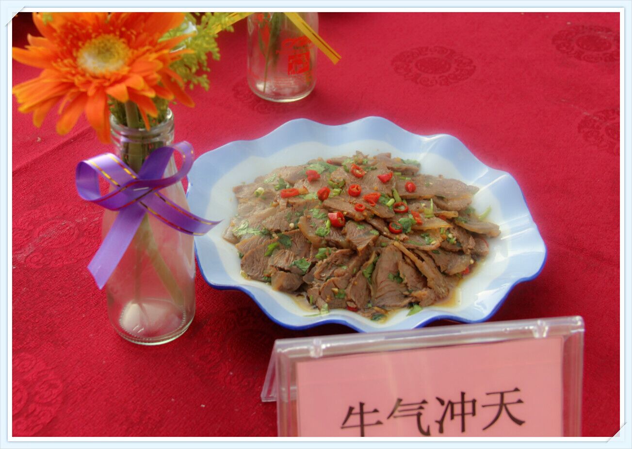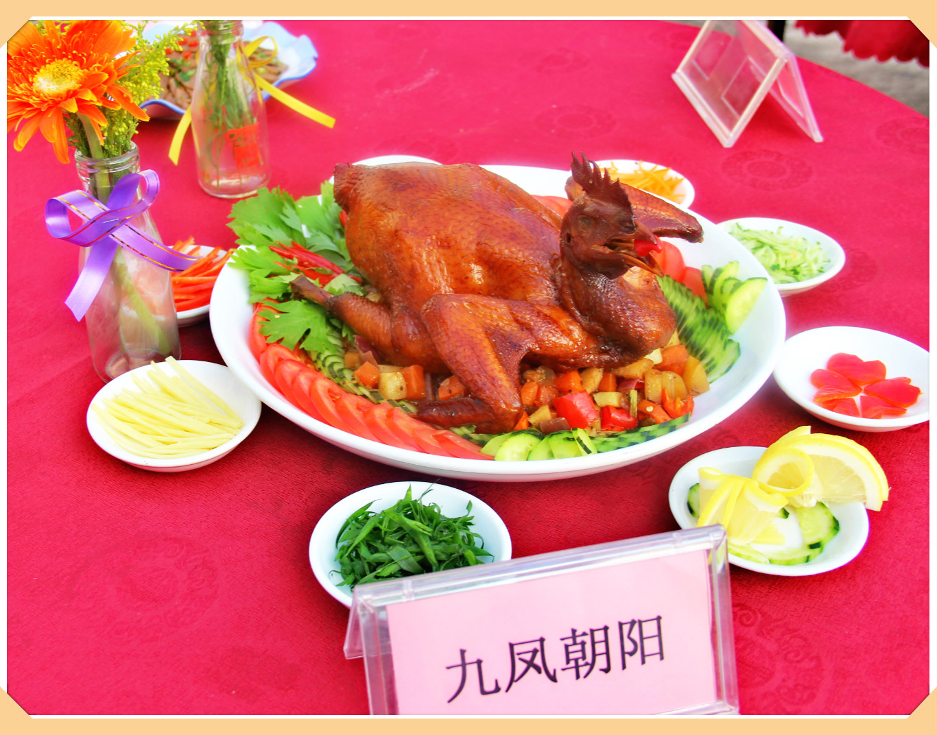 作品“九凤朝阳”,鸡在150摄氏度的烤箱中,高温烤制,皮脆肉嫩,香味十足,再分别以姜丝、葱丝、西红柿、柠檬等8道配菜围绕搭配,凸显了对美信未来的祝愿与期望,期望美信的业绩在行业中鹤立鸡群,更创新高;作品“牛气冲天”,薄薄的牛肉片,肉酥熟,原味醇香,配上青瓜丝垫底,再加上一点点红辣椒点缀,色香味俱全,令人食欲大增,也同时表达了对美信未来的业绩的期望,牛气冲天,大展宏图!