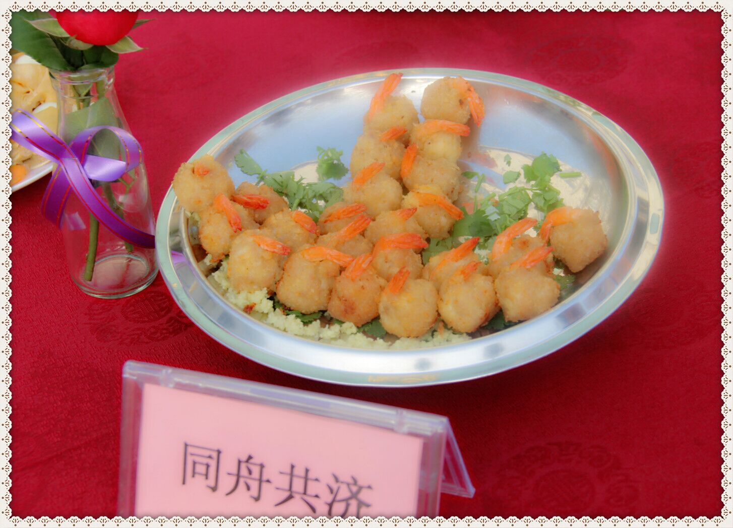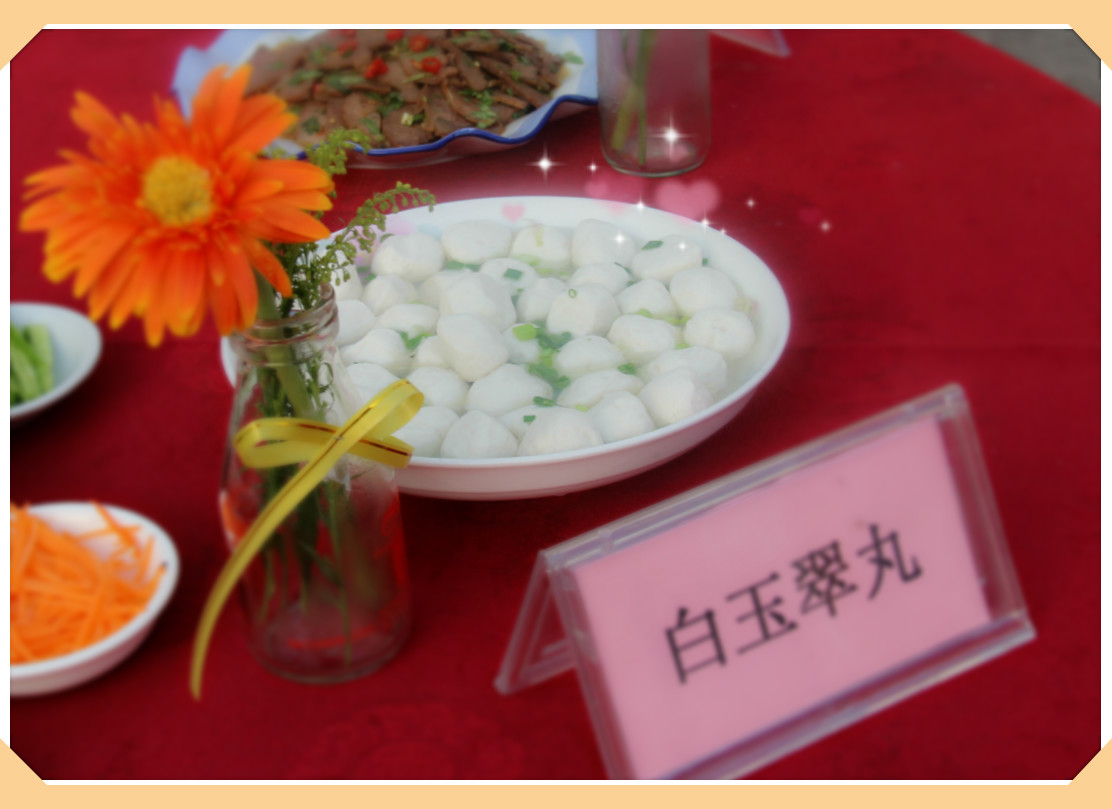 作品“同舟共济”,每一颗金黄色的虾丸拼成了一只船的形状,将作品的名字诠释得淋漓尽致,秀色可餐,令人垂涎欲滴,表达了愿与美信共成长的决心,只要一起团结互助,同心协力,一定能够战胜任何困难。作品“白玉翠丸”,一道手工打的鱼肉丸,经过高汤的翻滚,每一颗丸子都口感弹牙,鲜嫩。